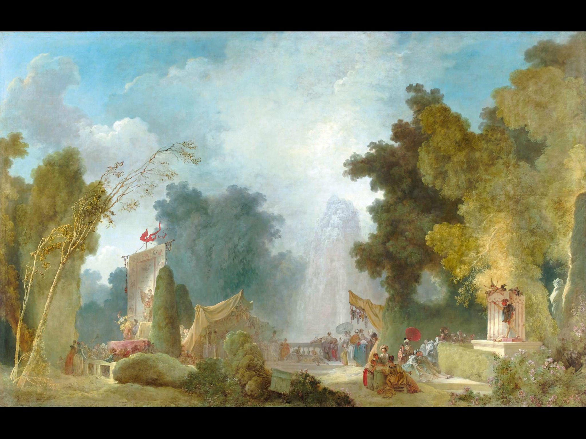 Fragonard ne pose pas le même regard sur une nature devenue solaire et élégiaque où l’homme se perd. Les groupes sont plus lointains, les arbres plus grands, plus présents encore, plus individualisés, faisant masse ou solitaires, droits, tordus… On distingue moins le jeu des regards qui individualise, mais une foule. Il ne s’agit plus non plus de musique ou de théâtre, mais de marionnettes et de bateleurs de foire… ce qu’il y avait d’aristocrates dans le tableau de Watteau est concentré au centre chez Fragonard – ou pas, noyés dans une populace encore bon enfant. Et le jet d’eau est la trouée fantomatique de lumière qui irradie toute l’oeuvre de reflets d’or. La nature n’est plus un faire-valoir de la civilisation, mais une force à la fois tranquille, domestiquée et pourtant redoutable par sa taille et sa violence possible : un coup de vent a couché la caisse au premier plan.