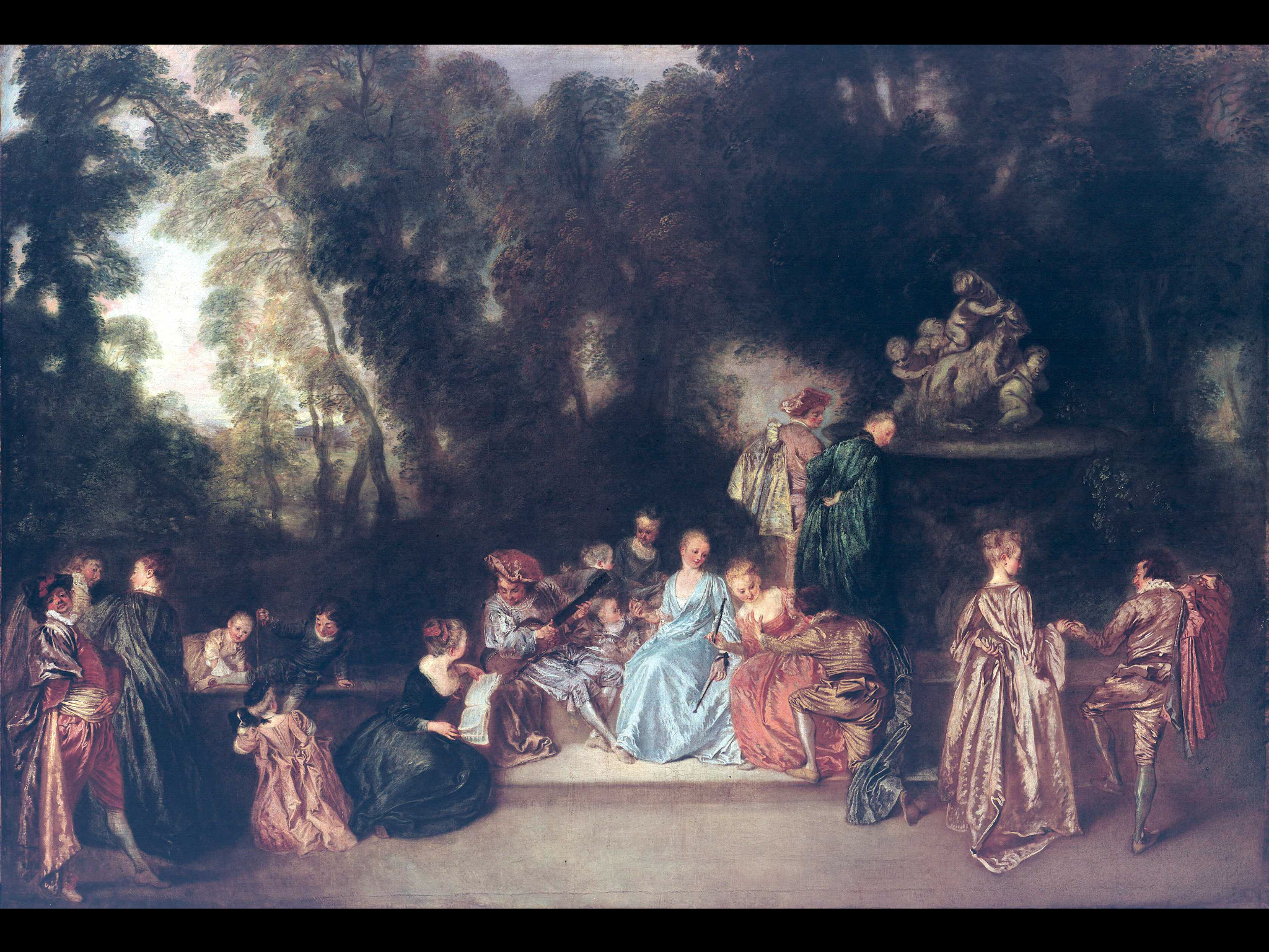 Watteau accorde à sa joyeuse bande plus d’importances apparentes : elle est cadrée plus serrée, plus proche de l’observateur qui en remarque les jeux de regards, les gestes et les incongruités qui troublent le sens. Un comédien à gauche fanfaronne, des enfants agacent un chien indifférent que protège une fillette trop sage; on joue de la musique et les mains, équivoques, se tendent, se touchent et se caressent. Les putti si innocents de la fontaine de pierre semblent vivants à jouer avec un bouc, allusion non voilée au plaisir de la chair. Et la forêt sombre incarne cet appel sauvage qui souligne le raffinement de ces jeux, policés et raffinés, comme Le Nôtre travaillait ces jardins : au-delà des parterres, derrière les murs de frondaisons, la campagne peut être, ou …